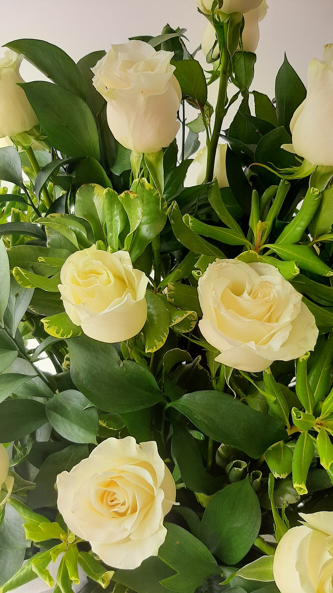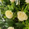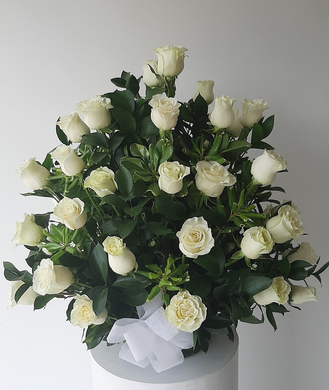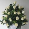 Ramo de rosas blancas y follaje. Ideal para expresar tus sentimientos de condolencias.