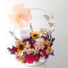 Arreglo de flores surtidas y follaje; sobre una cesta de fique que le da ese toque único y especial. Acompañado de Topper decorativo de acuerdo a la ocasión.