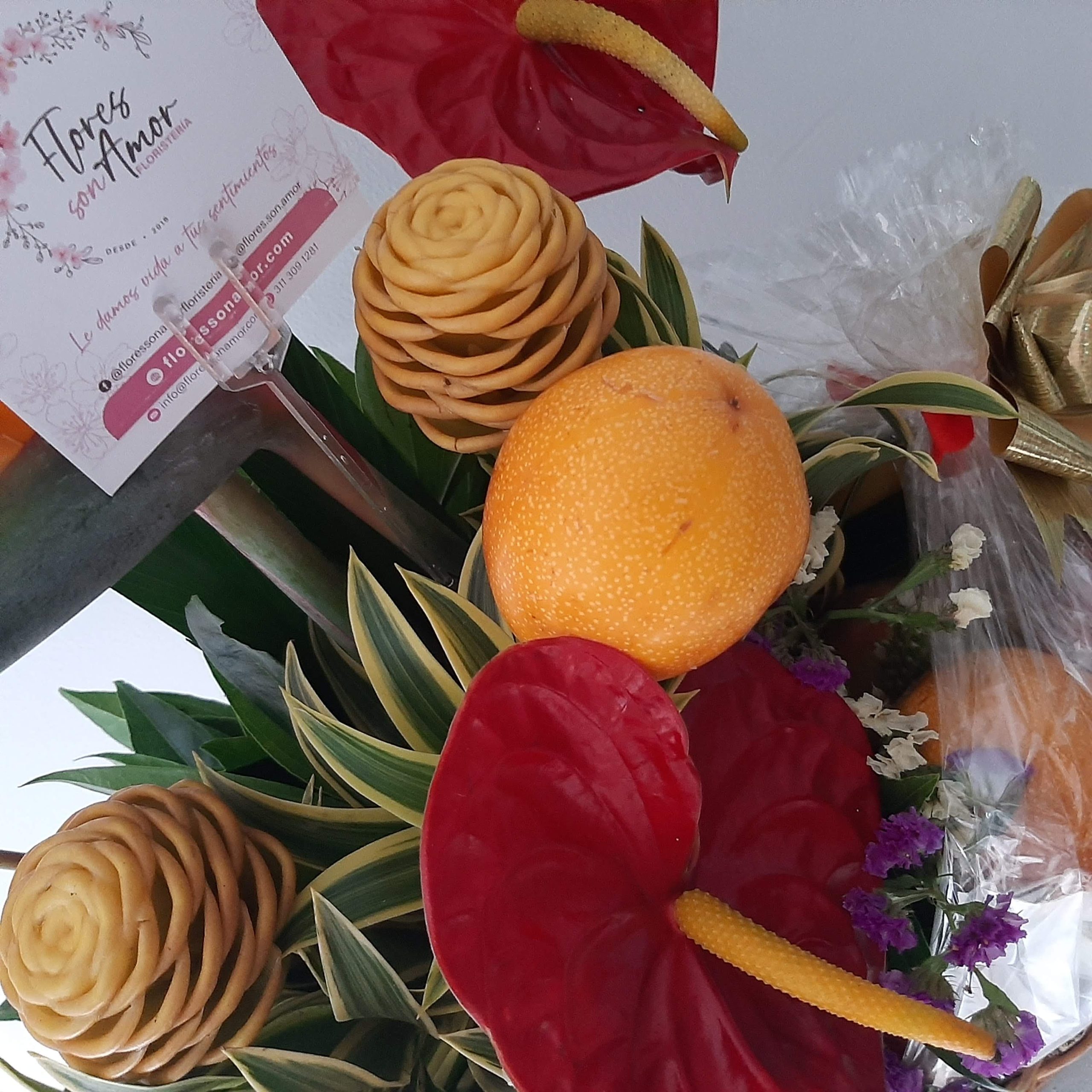 Canasta de Frutas Surtidas acompañado de arreglo floral Tropical. Presentación en canasta de fique.