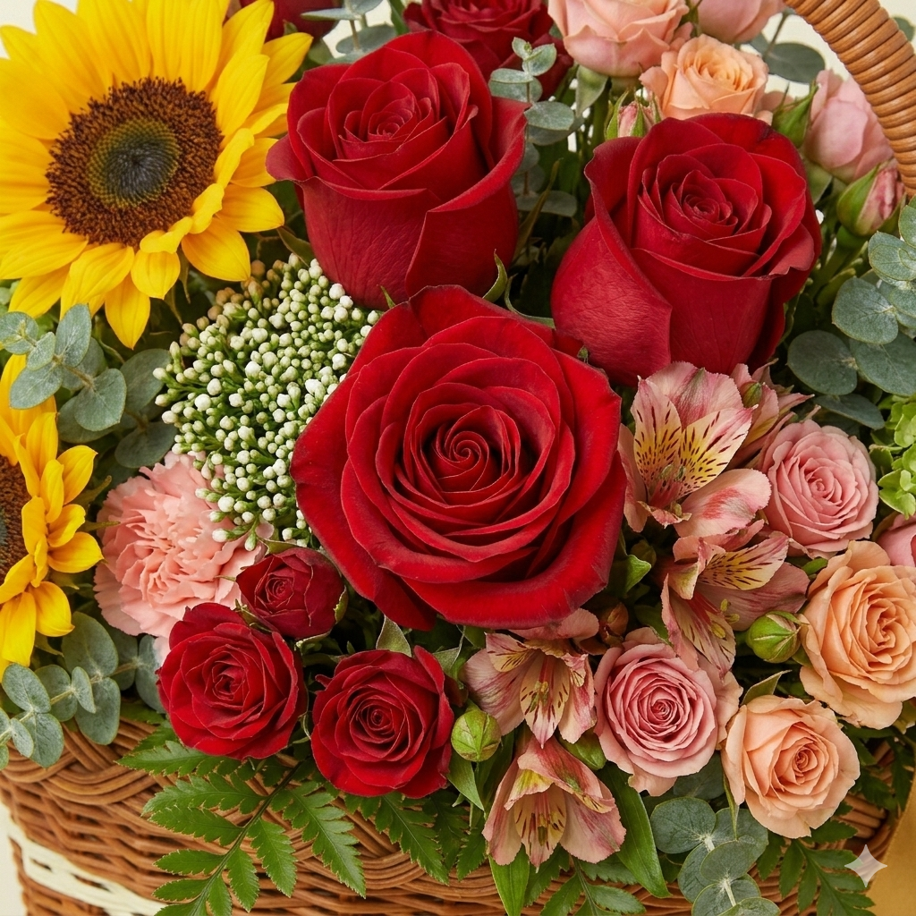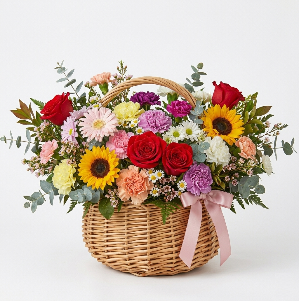 Hermosa composición floral elaborada en Rosas, Claveles, Girasoles y Follaje sobre canasta de Mimbre. Un bello recuerdo para obsequiar.