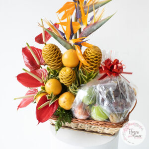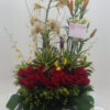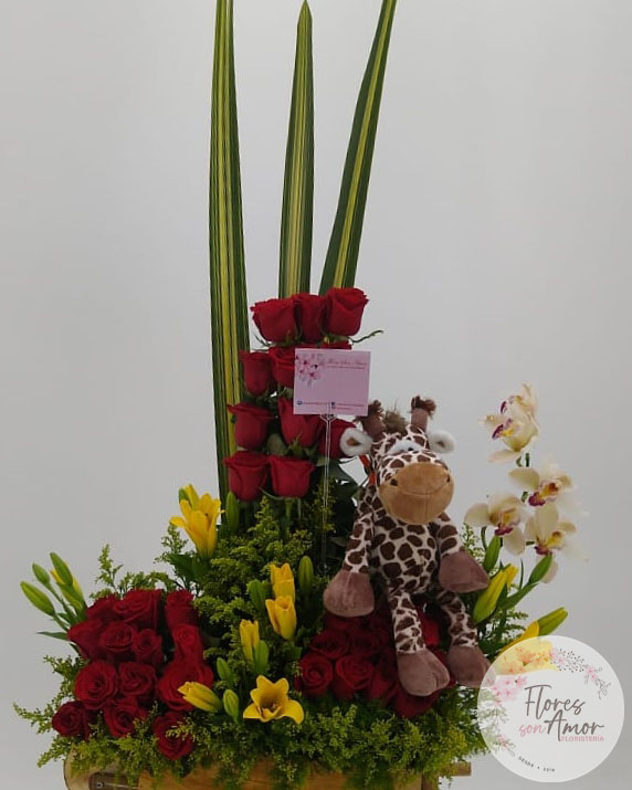 Arreglo Floral compuesto de 41-43 Rosas, Lirios, Orquídea Simbidium, Follaje y Peluche. Presentación en base de Madera