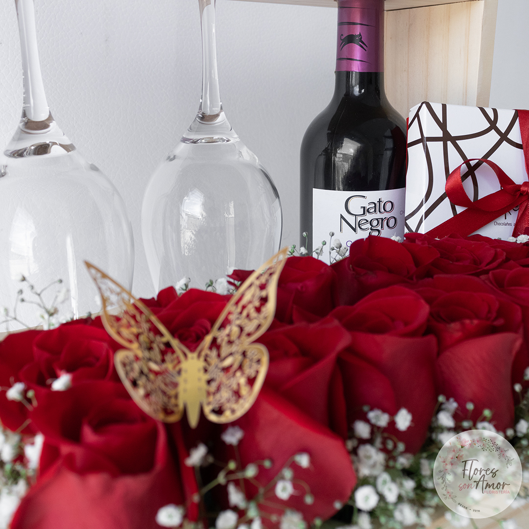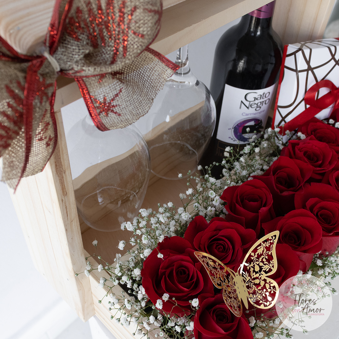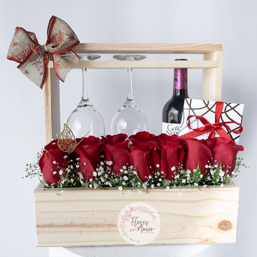 Hermosa cava de vino sobre base de madera, acompañada de 2 copas de cristal y un arreglo de 12 rosas y follaje. Incluye (1) caja de 9 chocolates surtidos Marca Santa teresa.