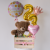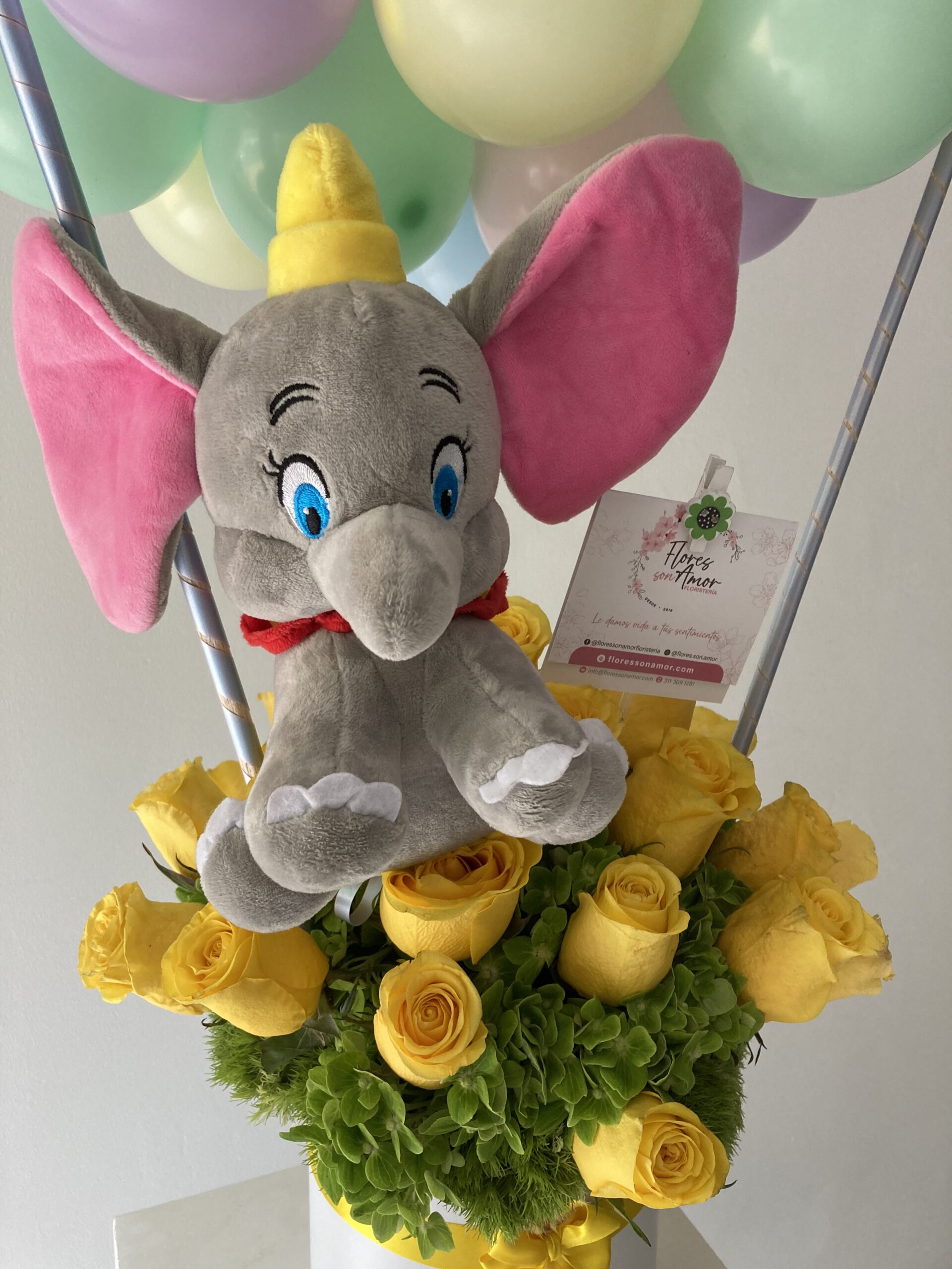 Un cilindro de rosas acompañado de un tierno peluche y un Globo aerostatico complemente redondo elaborado en globos. Ideal para nacimientos, cumpleaños infantiles o cualquier ocasión.