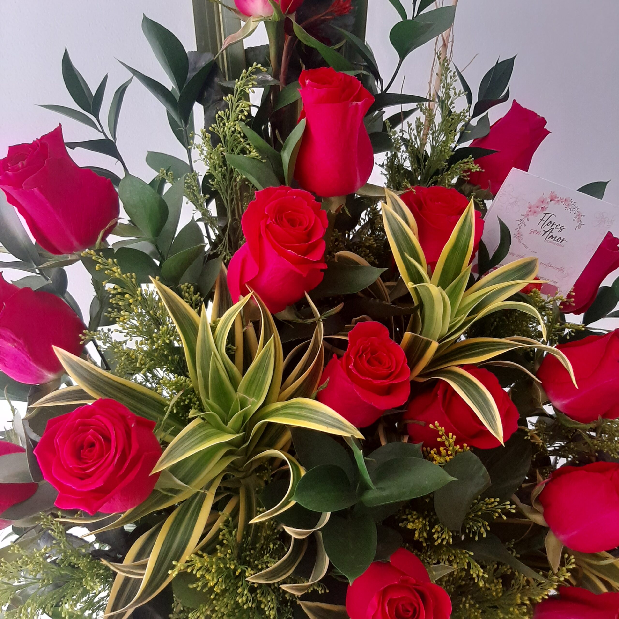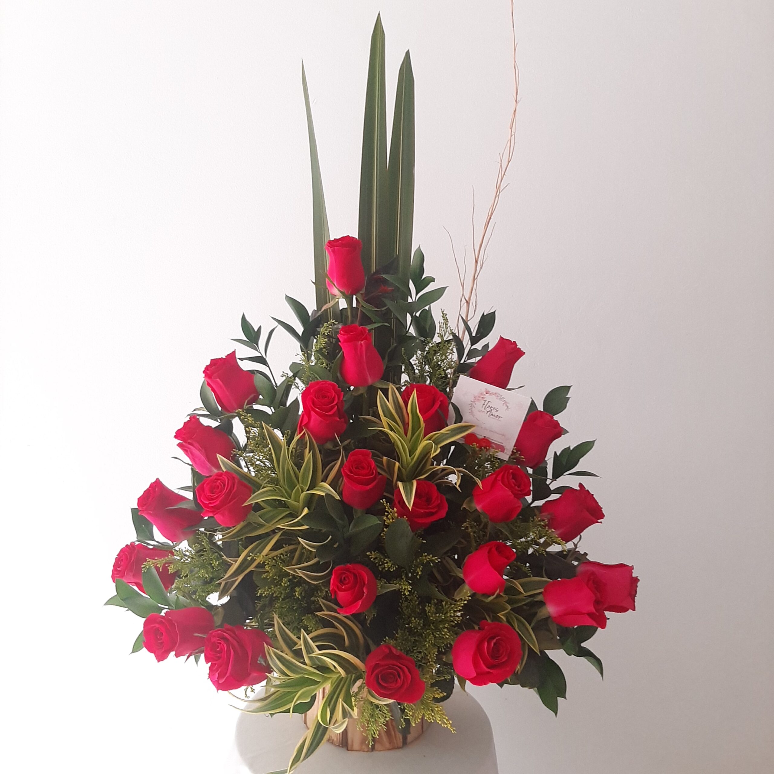 Arreglo clásico de 24 rosas, acompañado de follaje.