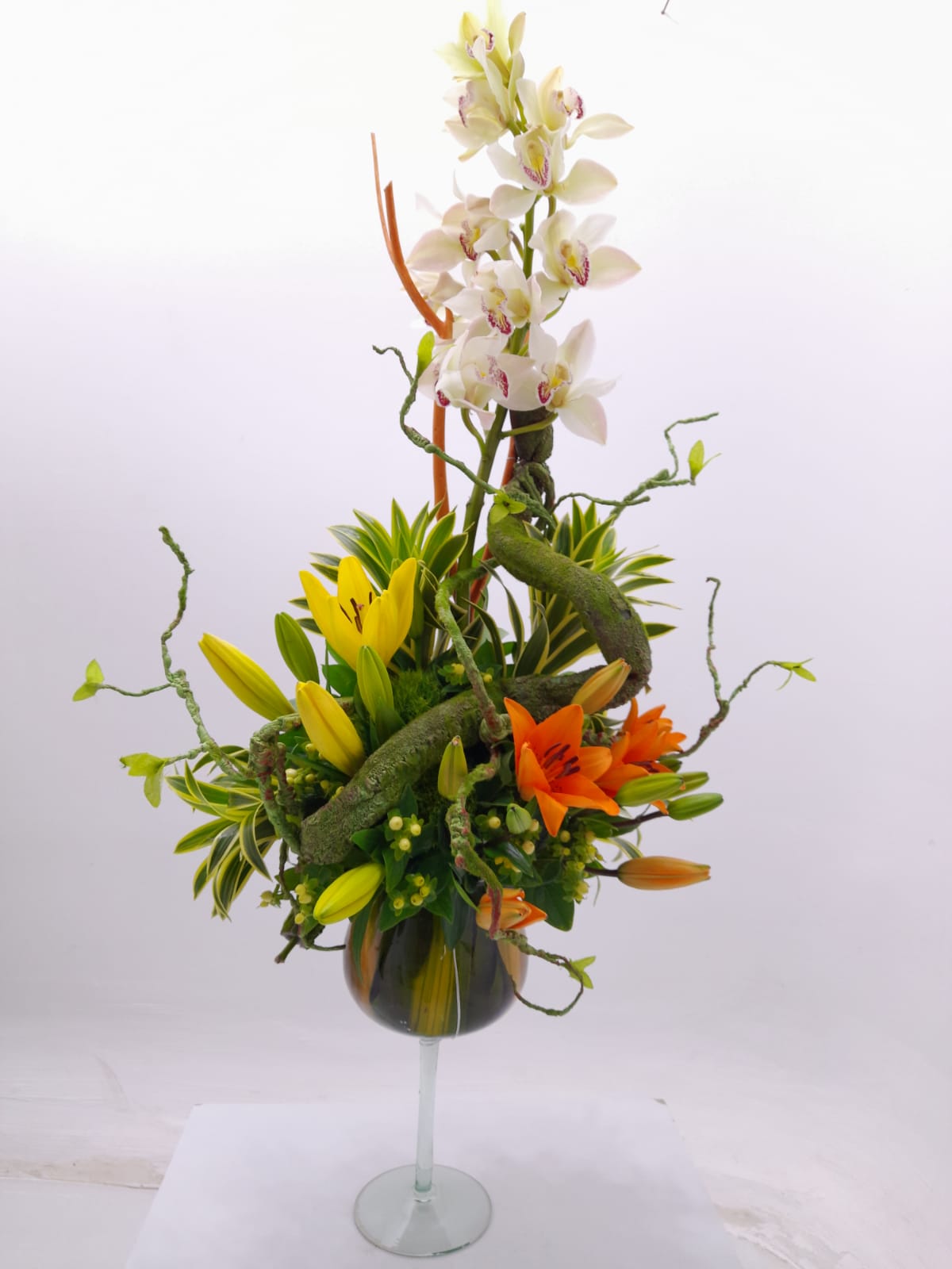 Elegante arreglo elaborado en Lirios, orquideas simbidium doble, follaje y un tronco que le da un toque diferencial a hermoso arreglo floral.