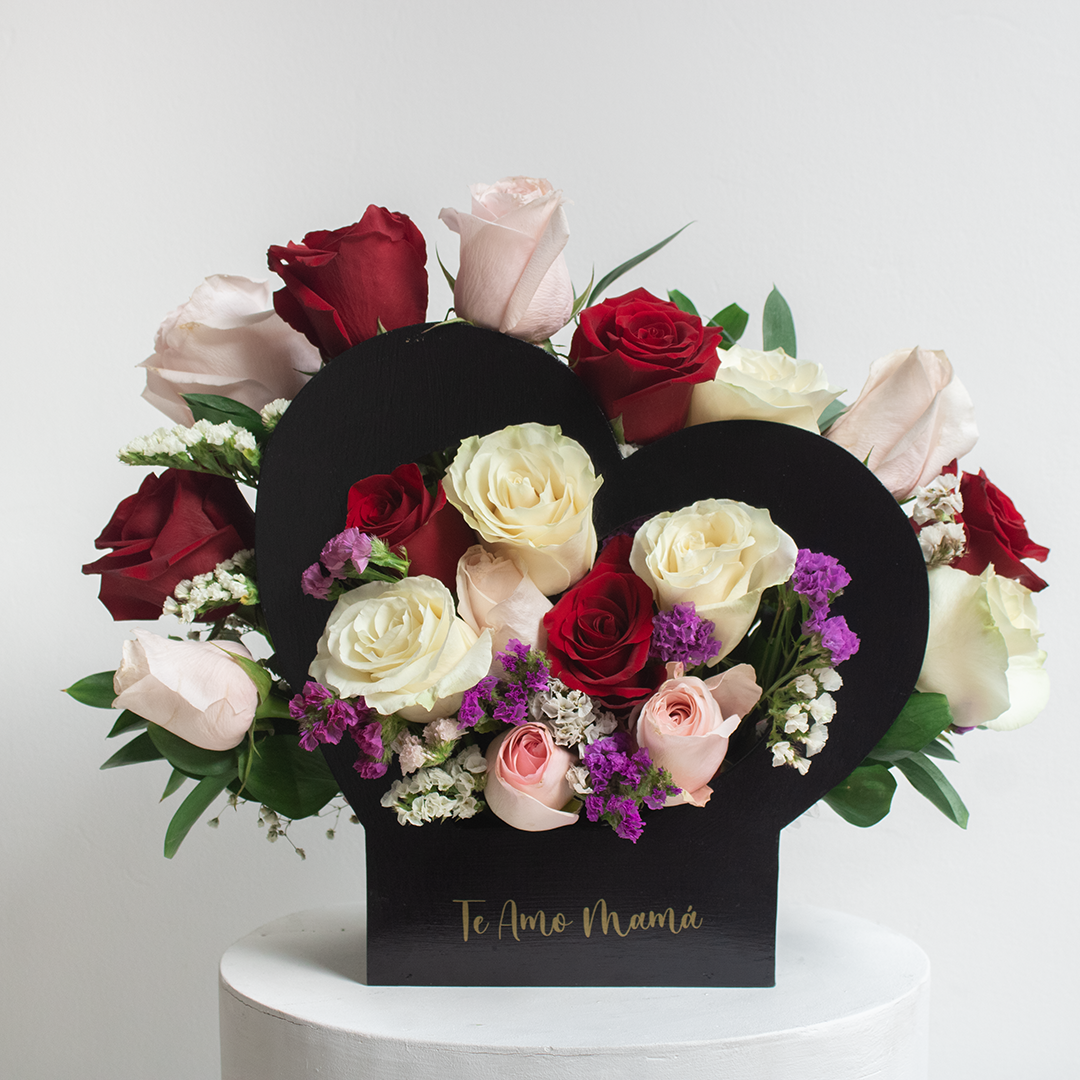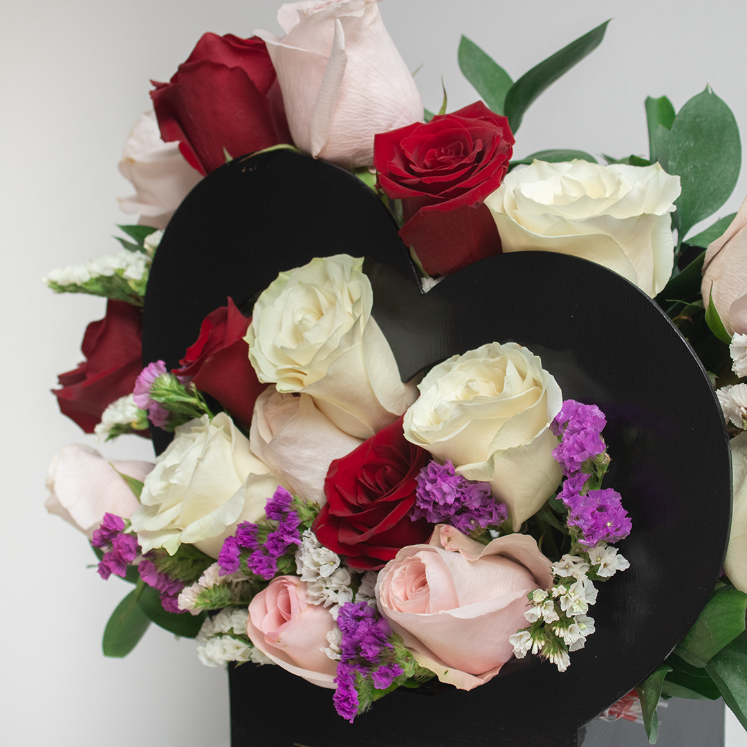 Delicado arreglo de rosas sobre una base corazón de madera. Tan delicado como tus sentimientos por esa persona que recibirá este bello arreglo floral.