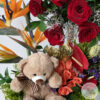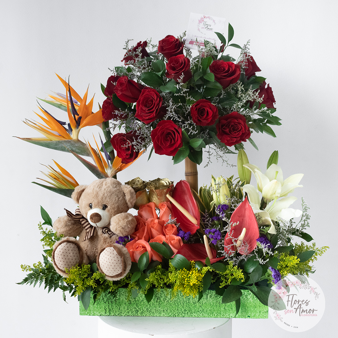 Arreglo tipo Jardín de flores surtidas: Rosas, Anturios, Lirios, Aves del Paraiso y follaje variado, acompañado de un peluche mediano.