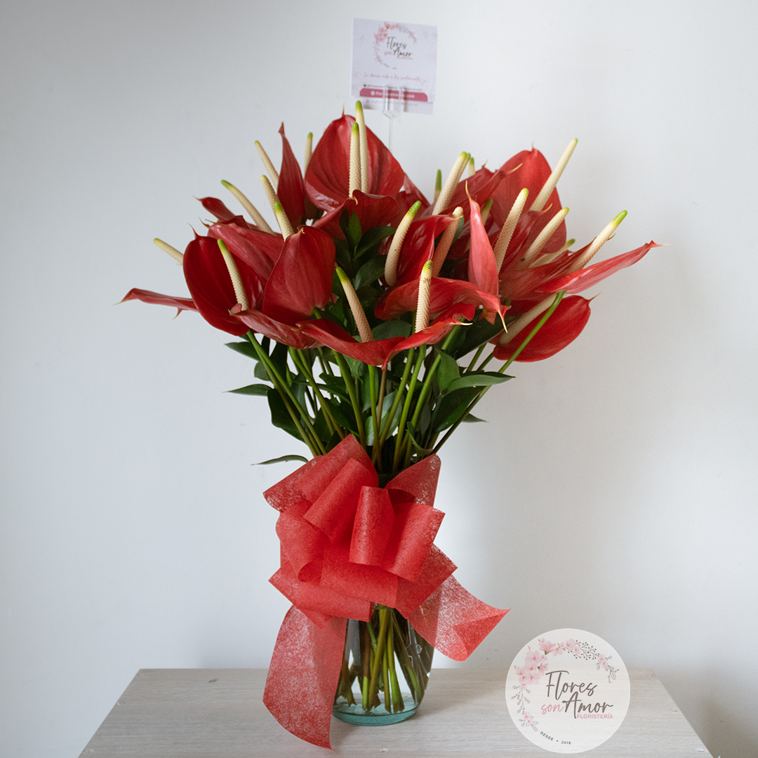 Jarrón de 36 anturios medianos, un arreglo elegante y duradero.