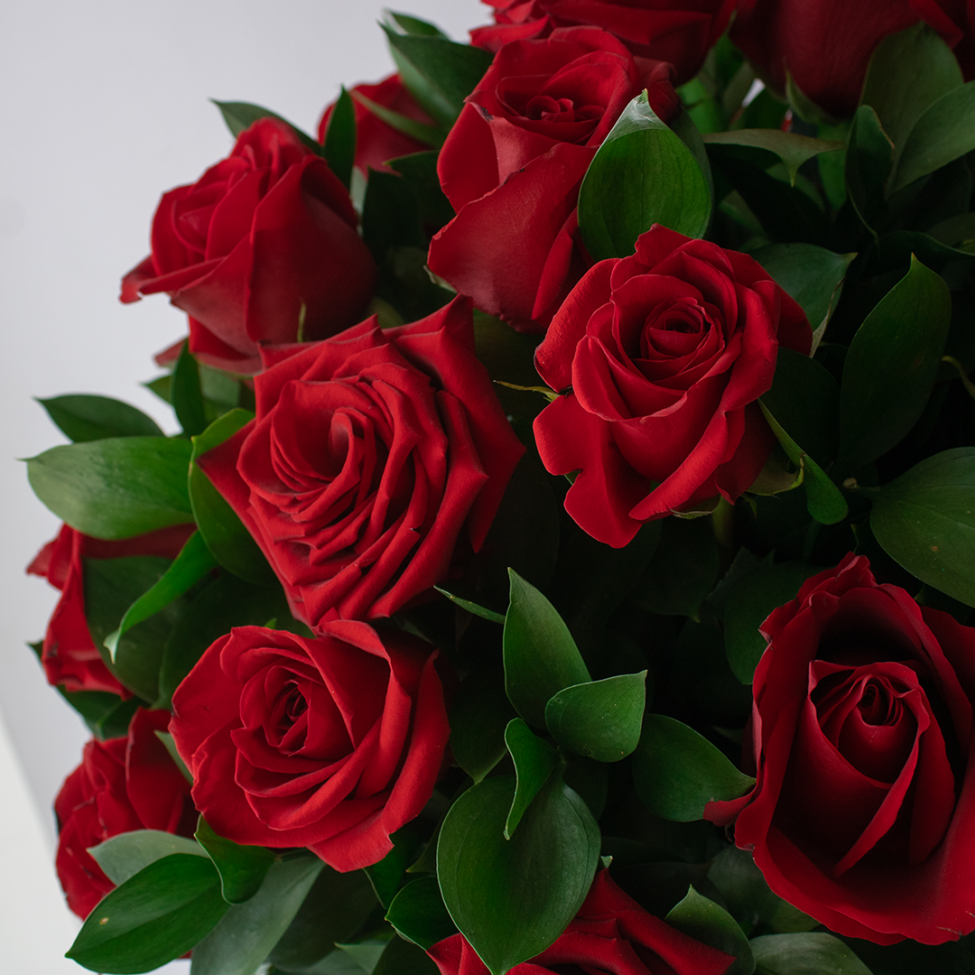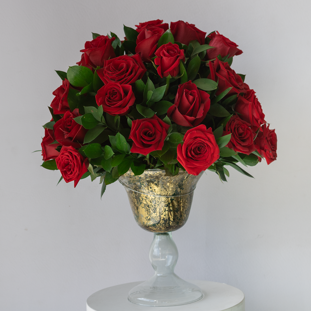 Arreglo floral elaborado con 36 rosas y follaje sobre un hermoso jarron de cristal. Un detalle sutil y elegante para sorprender en cualquier ocasión.