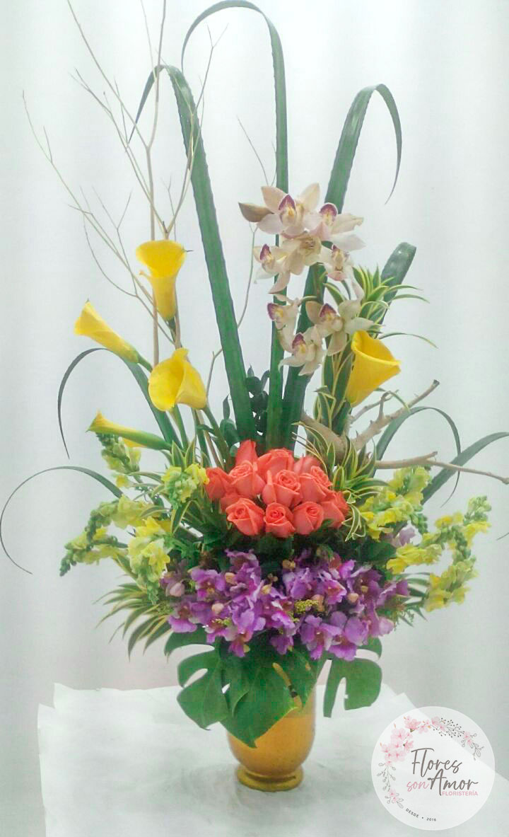 Arreglo Floral con 12 rosas, Orquidea Hawaiana, Cartuchos, Simbidium Doble, Canción de la India y Follaje. En presentación de jarrón mediano.