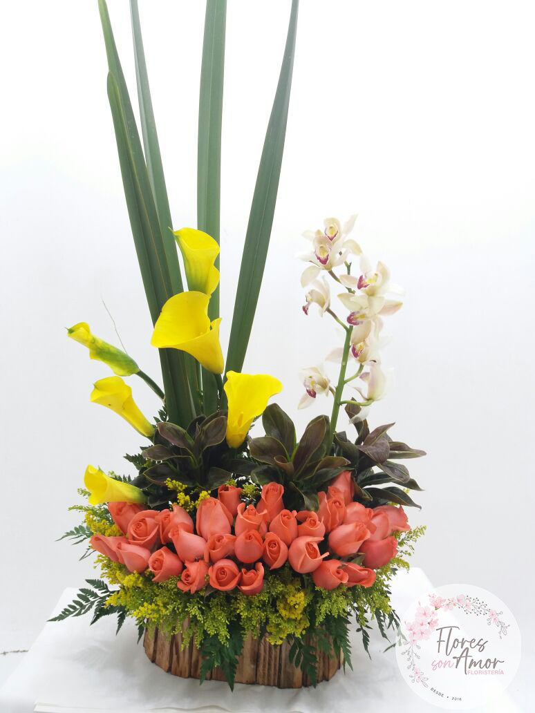 Arreglo Floral Surtido con 33-36 rosas, Cartuchos, Simbidium Doble, Follaje.