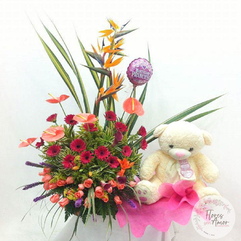 Arreglo Floral Surtido con 22-24 rosas, Lirios, Gerberas, Anturios, Canción de la India, Aves del Paraíso Follaje, Peluche Extra Grande y Globo metalizado. Peluche sujeto a disponibilidad.