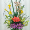 Arreglo Floral de Surtido con 30 rosas, 6 girasoles, canción de la india, rusco, follajes y frutas. Presentación en canasta de madera.
