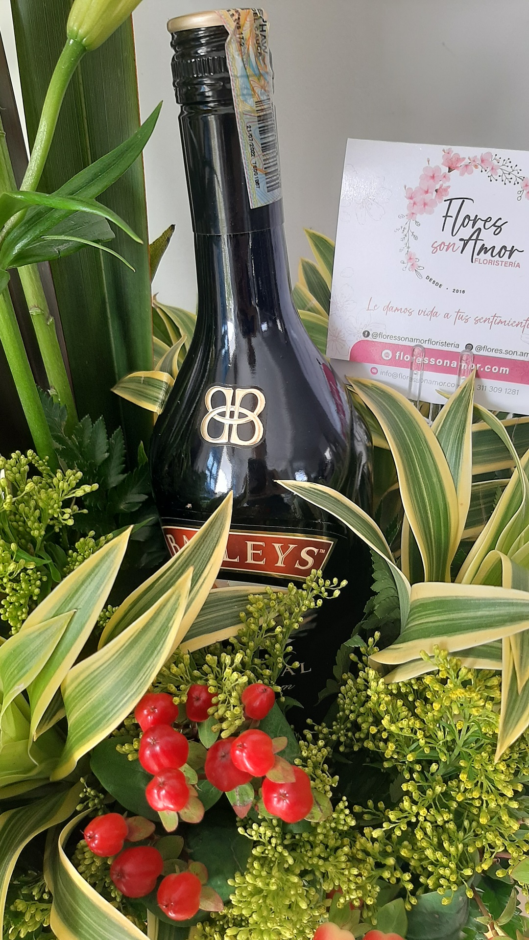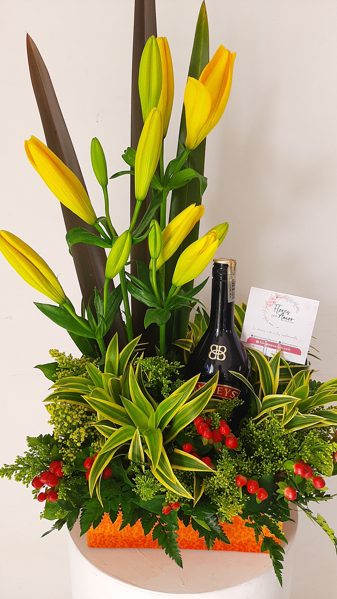 Arreglo Tropical elaborado en Lirios, flores tropicales y follaje. Acompañado de 1 botella de Baileys 700 ML,