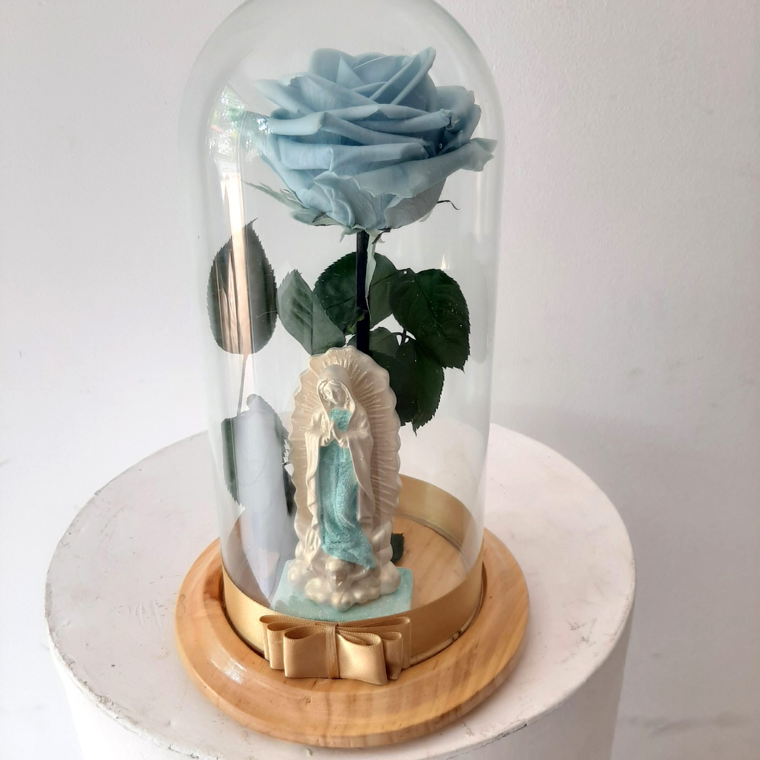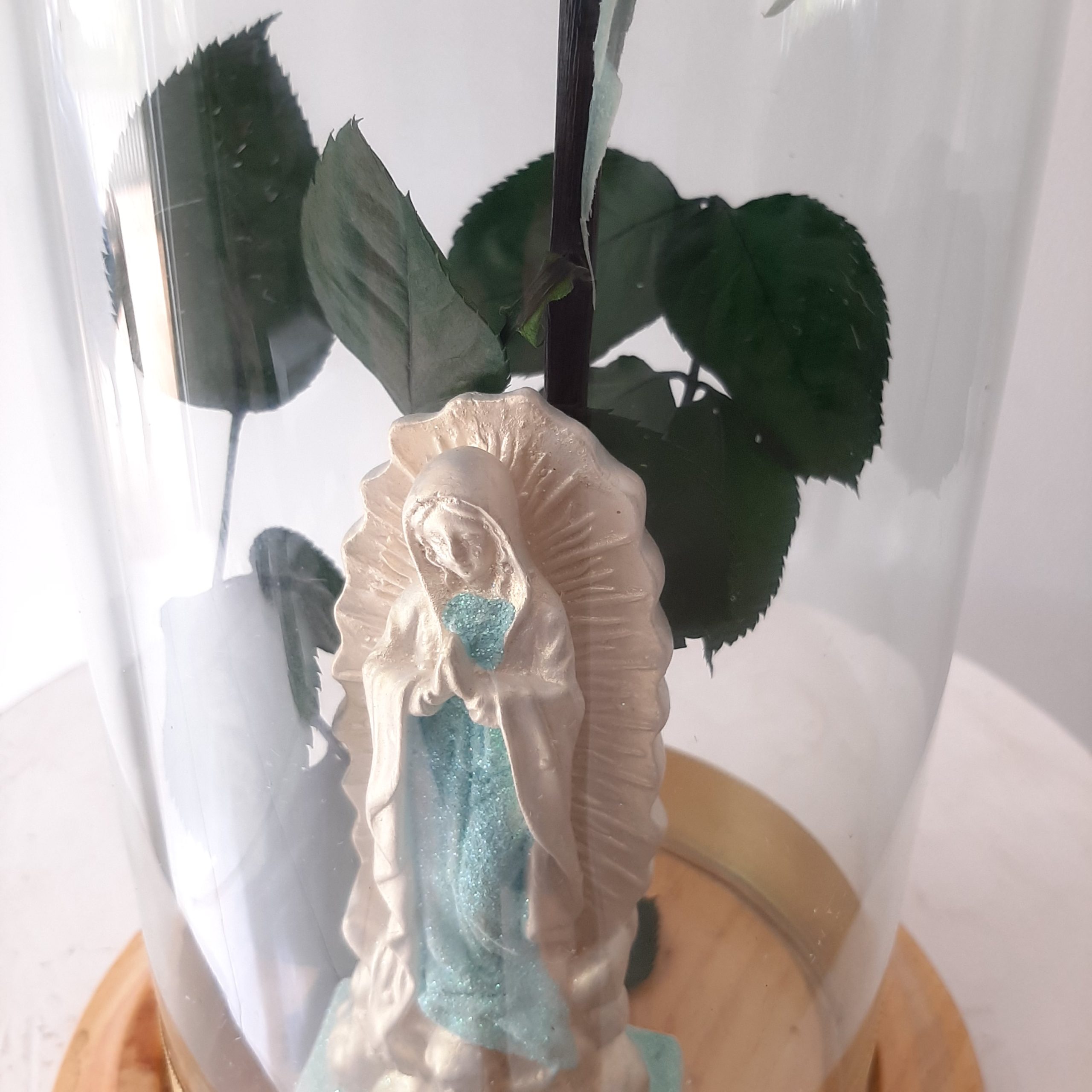 Una hermosa imagen de la Virgen de Guadalupe elaborada en yeso, acompañada de una rosa natural preservada tamaño Premium con una duración aproximadamente de 2 años. Es un detalle único y muy especial.